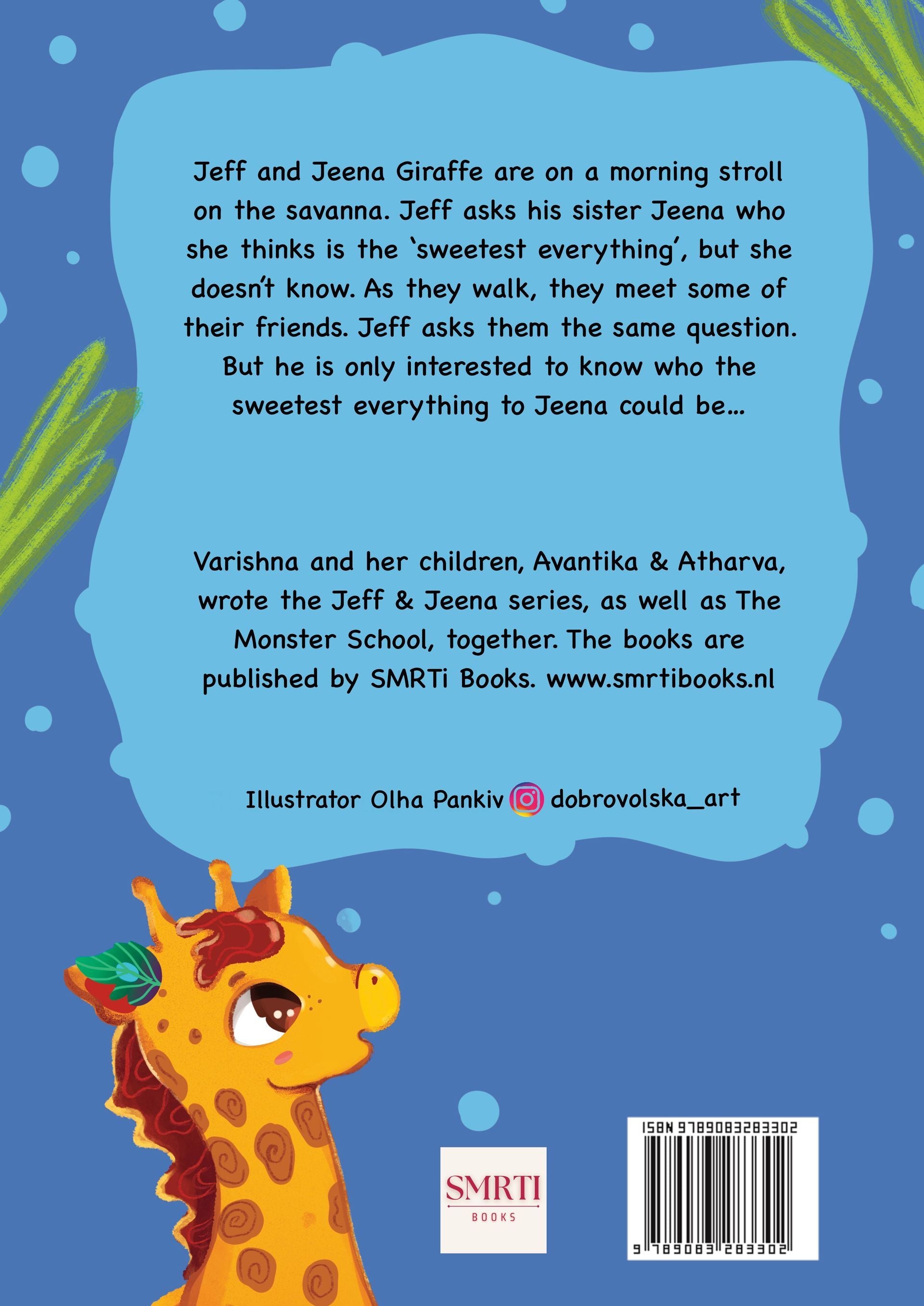 Jeff and Jeena Giraffe are on a morning stroll on the savanna. Jeff asks his sister Jeena who she thinks is the ‘sweetest everything’, but she doesn’t know. As they walk, they meet some of their friends. Jeff asks them the same question. But he is only interested to know who the sweetest everything to Jeena could be…